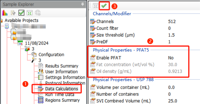 参数错误修正:测试后若发现预稀释系数或PFAT5参数设置错误,无需重测——在“sample explorer”中选中对应结果,下拉菜单选“Data Calculations”,调整参数后点绿色应用标识,重新生成报告即可(原始数据和报告历史版本保留,修改记录可通过 “Audit Logs”审计追踪查阅);