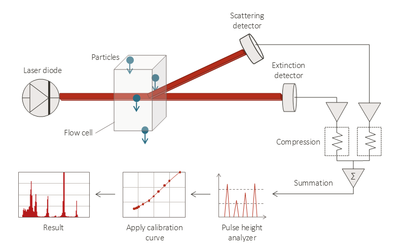 仪器通过一步或二步稀释技术,将样品浓度调整至传感器最佳检测范围,随后稀释后的样品进入传感器,颗粒逐一流经检测区与激光作用,仪器自动采集光信号、分析数据。