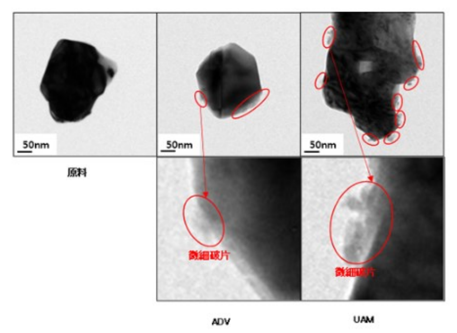 常见分散方法的球磨法或砂磨机,在分散时物料、磨珠与机体之间的撞击会对陶瓷浆料中的陶瓷粉体造成磨损,磨损的材料进入浆液中会变成难以除去的杂质这对浆料的纯度产生不利的影响,此外,在某些特定情况下,研磨分散过程还会改变粉体的物理化学性质。例如,增加晶格不完整性,形成表面无定形层等,影响后续烧结等工艺,日本HMM珠磨机的ADV机型能有效减少对陶瓷浆料的损伤。如下图的TEM照片所示,采用HMM的UAM机型处理时有很多碎片,初步分析是由于粒子破坏而产生的钛酸钡,但是采用ADV机型处理中几乎没有发现钛酸钡碎片。